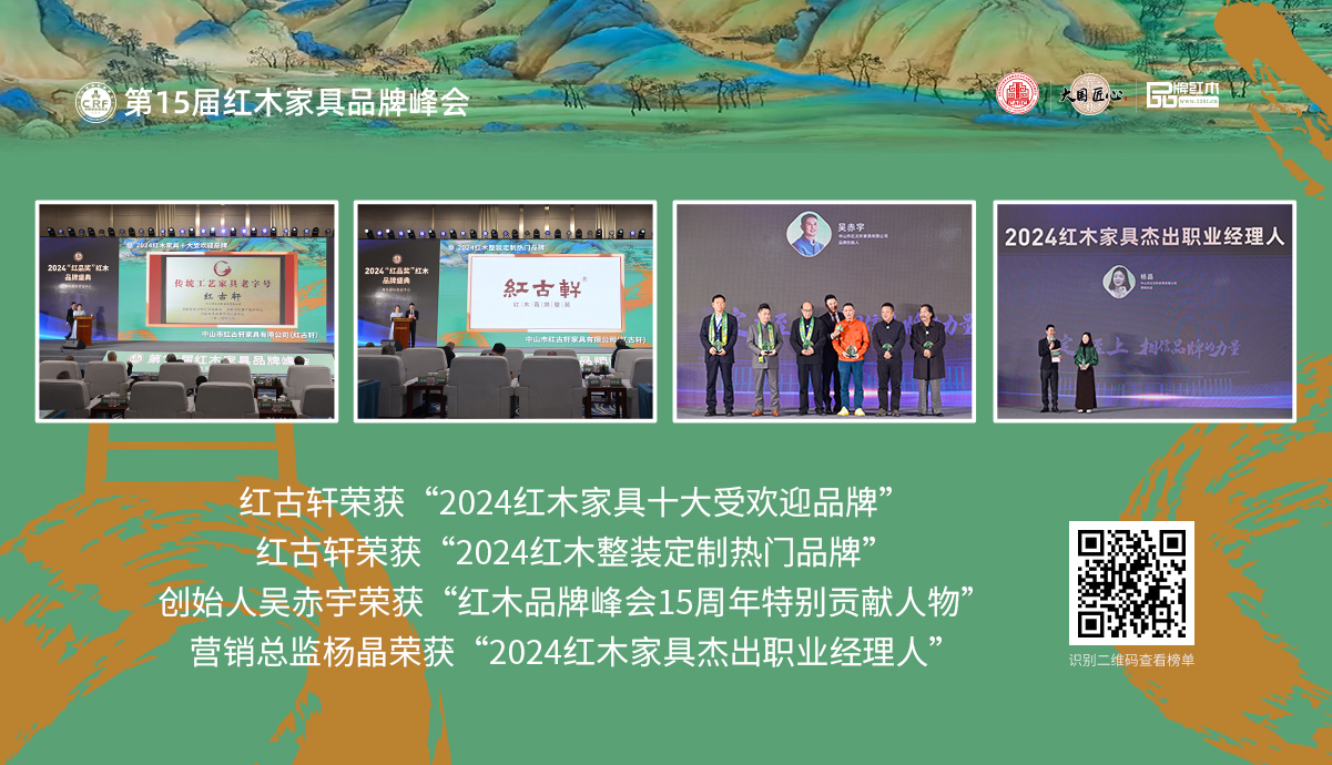 禮遇千年前的中國(guó)智慧 格物致知 修身齊家 走進(jìn)紅古軒 一廿間,二十八載。28年,跨越時(shí)代進(jìn)入新紀(jì)元;28年,待時(shí)乘勢(shì),根深葉茂;28年,讓新中式成為時(shí)代。 創(chuàng)始人故事 1997年創(chuàng)立紅古軒,2002年在紅木行業(yè)提出“新中式紅木家具”。如今,紅古軒以富于藝術(shù)創(chuàng)造的產(chǎn)品與文化引領(lǐng)紅木家具發(fā)展... 品牌故事 品牌榮耀 品牌歷程 人物故事